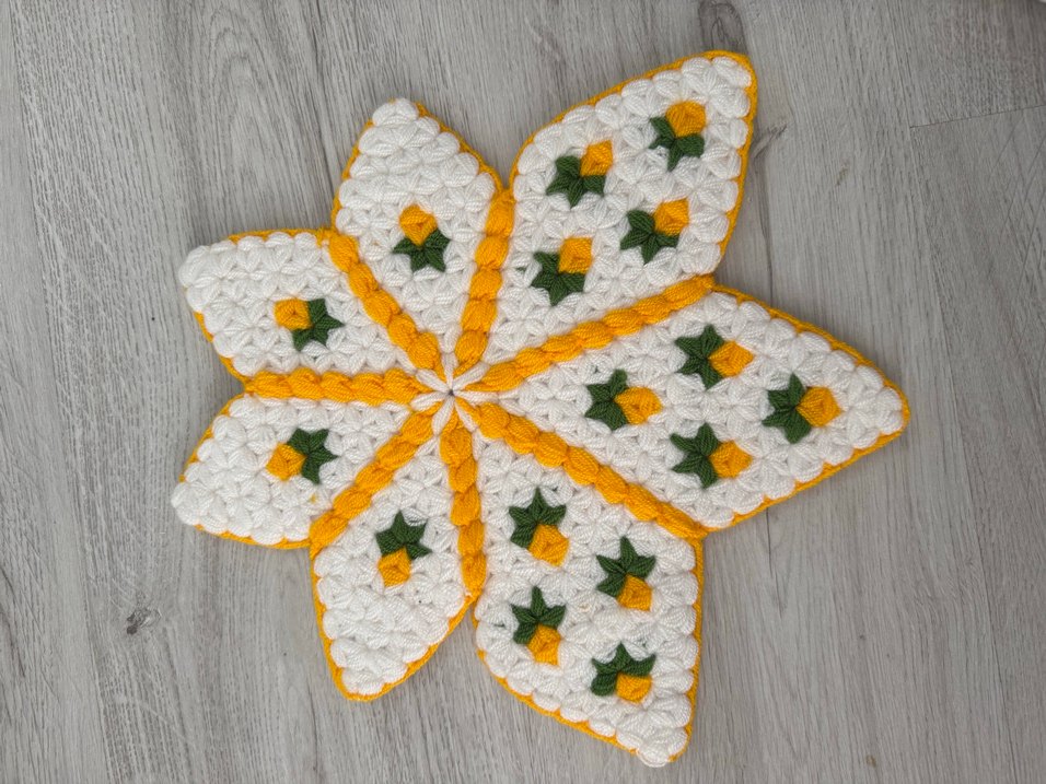 Yumuşak iplikten yapılmış, beyaz zemin üzerine sarı ve yeşil çiçek desenli, yıldız şekilli el örgüsü dekoratif örtü.
