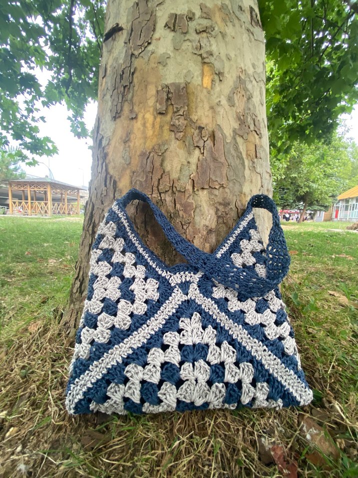 Mavi ve gri renklerde, örgüyle hazırlanmış, rahat bohem tarzda kadın çantası. Dış mekan kullanımı için uygundur.