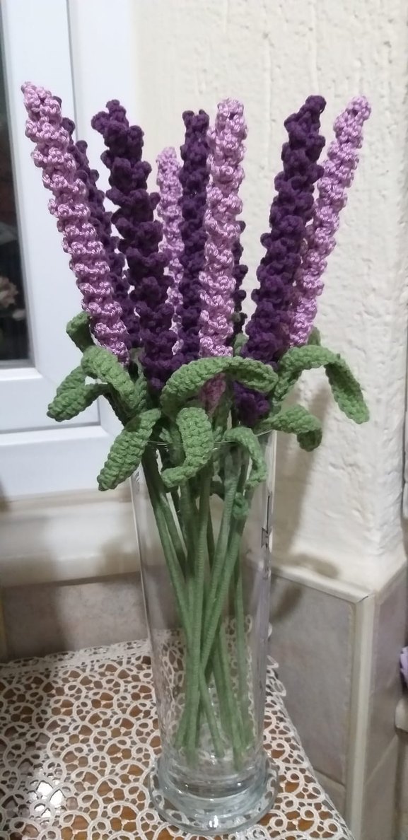 El örgüsü, bohem tarzda mor lavanta çiçekleri ve yeşil tığ işi yapraklar, şeffaf vazoda sergileniyor.