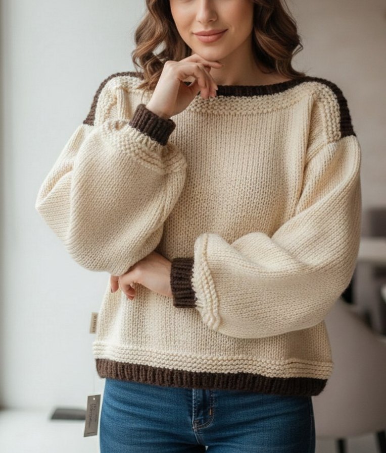 Pinterest tarzı el örgüsü kazak arayanlar buraya! Krem ve kahve tonlarının en güzel uyumuyla örüldü. Balon kolları ve dökümlü duruşuyla jeanlerin üzerinde harika duruyor. Tamamen el yapımı ve sıfır üründür. Kaçırmayın!