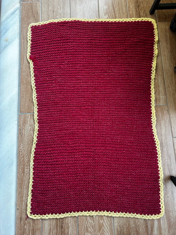 bordo renkli el örgü yapılmış, sarı kurdele kenarlı el örgüsü paspas .