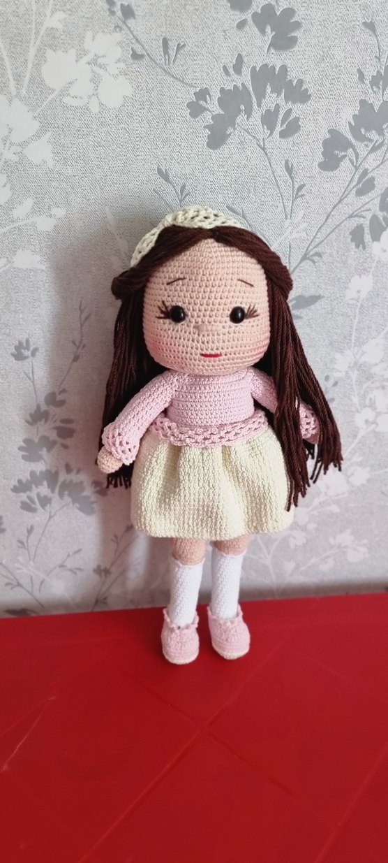 Uzun kahverengi saçlı, el örgüsü üst ve yumuşak bej etekli pastel renklerde bebek. Beyaz çorap ve pembe ayakkabı ile tamamlanmıştır.