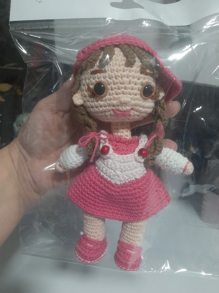 El örgüsü bebek, pastel pembe elbise, şapka ve ayakkabılarla, detaylı yüz nakışı ve örgülü saçlara sahip,elbise ve şapkası çıkartılabilir,koton ip,silikon dolgu ,kilitli göz kullanılmıştır,bebekler ve çocuklar için güvenli ve doğal bir oyuncaktır