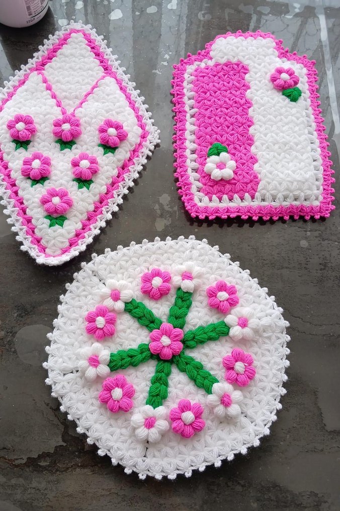 Pembe ve beyaz renklerde, çiçek desenli, yeşil yaprak detaylı üç adet el örgüsü lif seti.