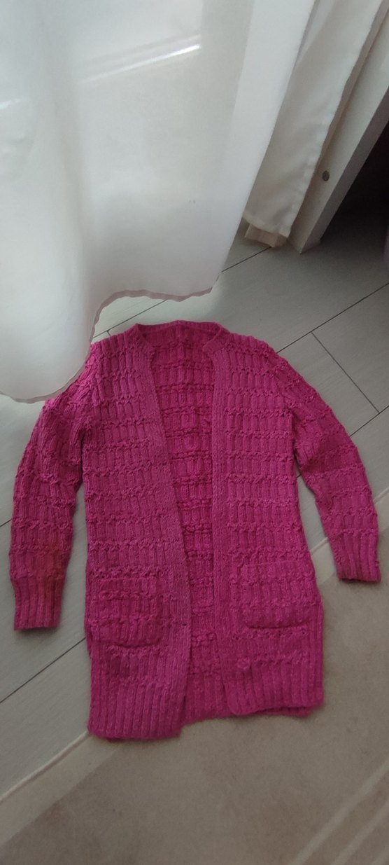 Koyu pembe renkli, el örgüsü hırka, uzun kollu ve yuvarlak yaka detaylıdır. Rahat kesimi ve midi boyu ile gündelik kullanıma uygundur.