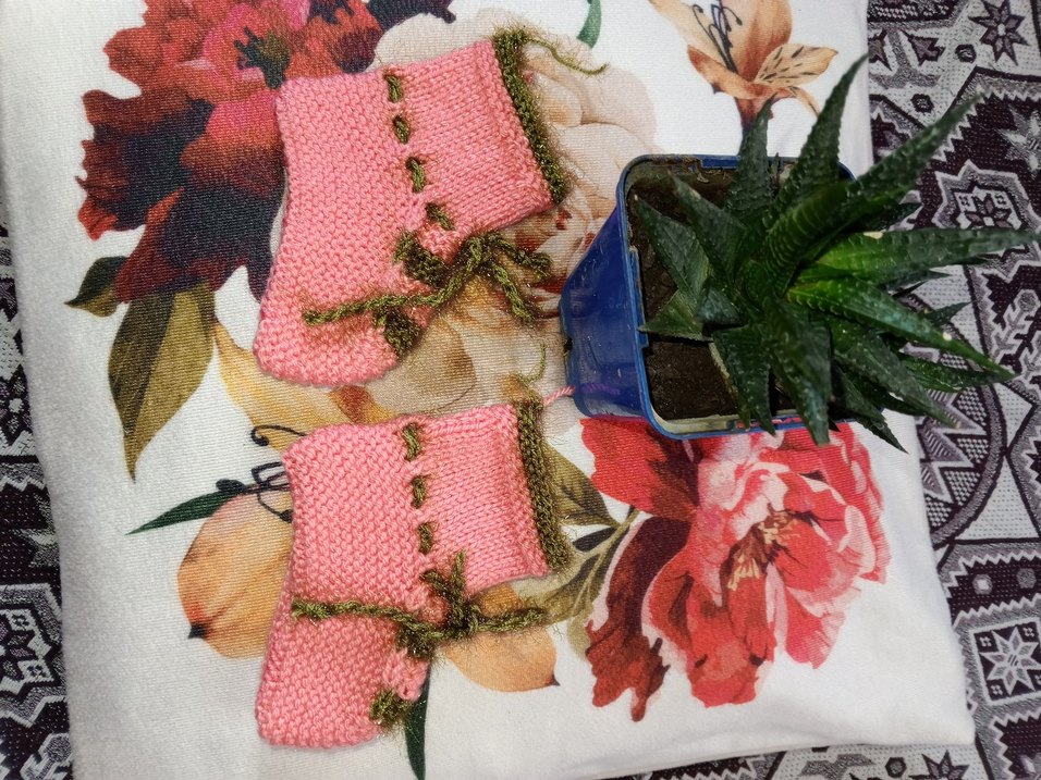 El örgüsü pembe, yeşil detaylı küçük saksılar için kılıf. Ev dekorasyonuna sıcaklık katar.