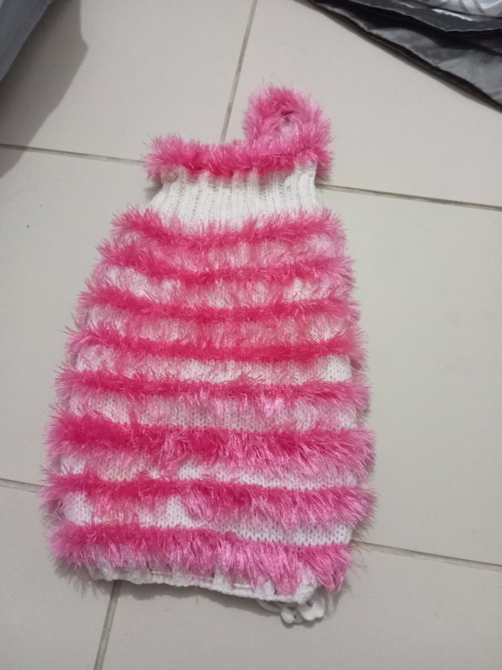 Renkli pembe çizgili, örgü ve tüylü yumuşak iplikten yapılmış kedi kıyafeti, counterculture tarzında. posetlik