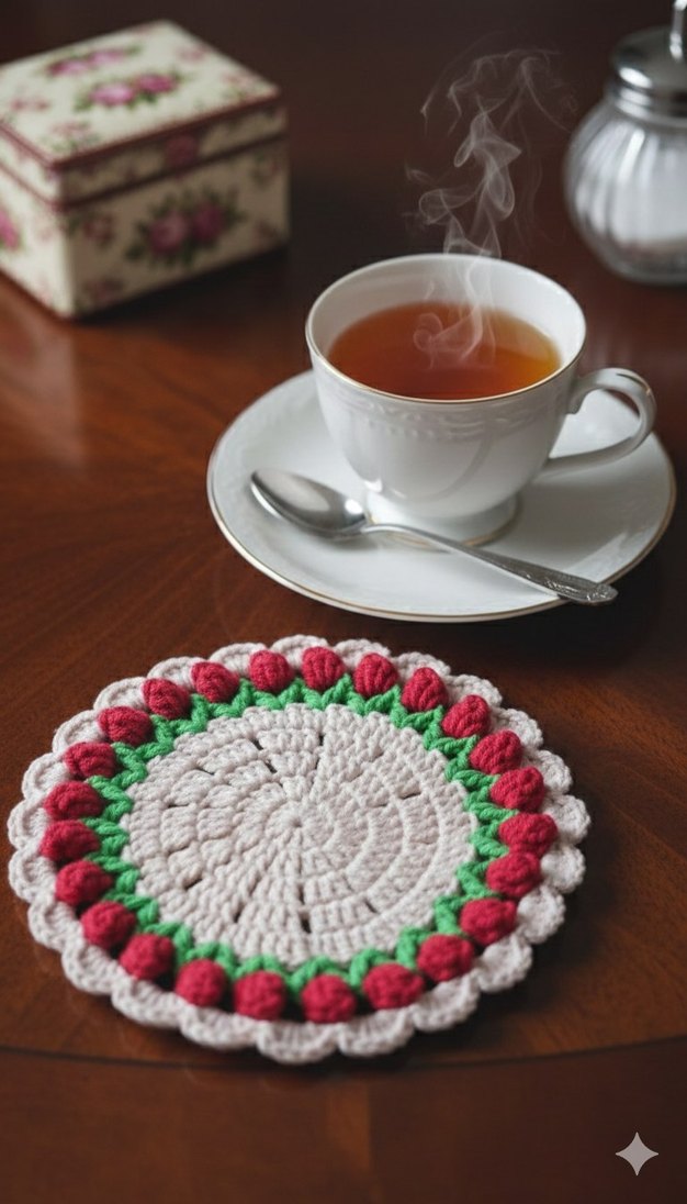 Kırmızı, yeşil ve beyaz renklerde, geleneksel desenli el örgüsü bardak altlığı, sıcak içeceklerin altını korur. Aynı gün kargo imkanı Şık bir hediye fikri