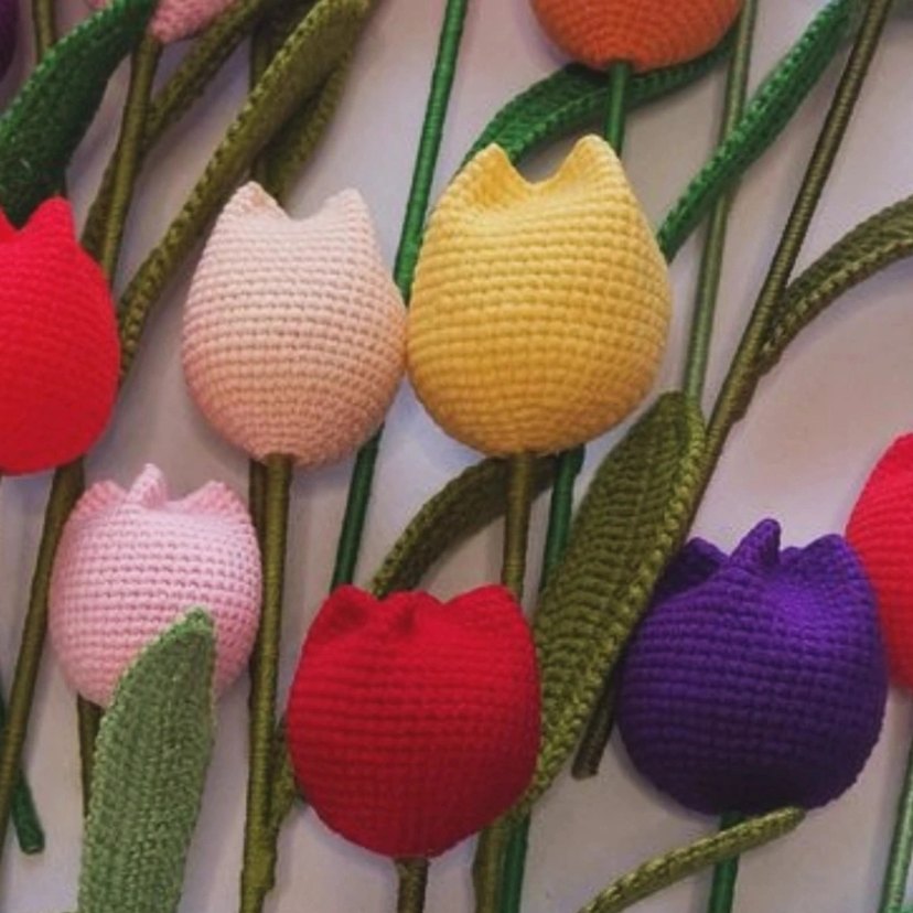 Yumuşak iplikle örülmüş, yeşil sap ve yapraklı, bohem tarzda renkli el örgüsü lale süslemeleri.