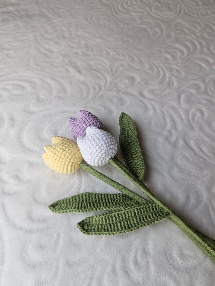 Sarı, beyaz ve mor renklerde el örgüsü laleler ve yeşil yapraklar, el işçiliğiyle hazırlanmıştır. istediğiniz renklerde ve şekilde örülür.