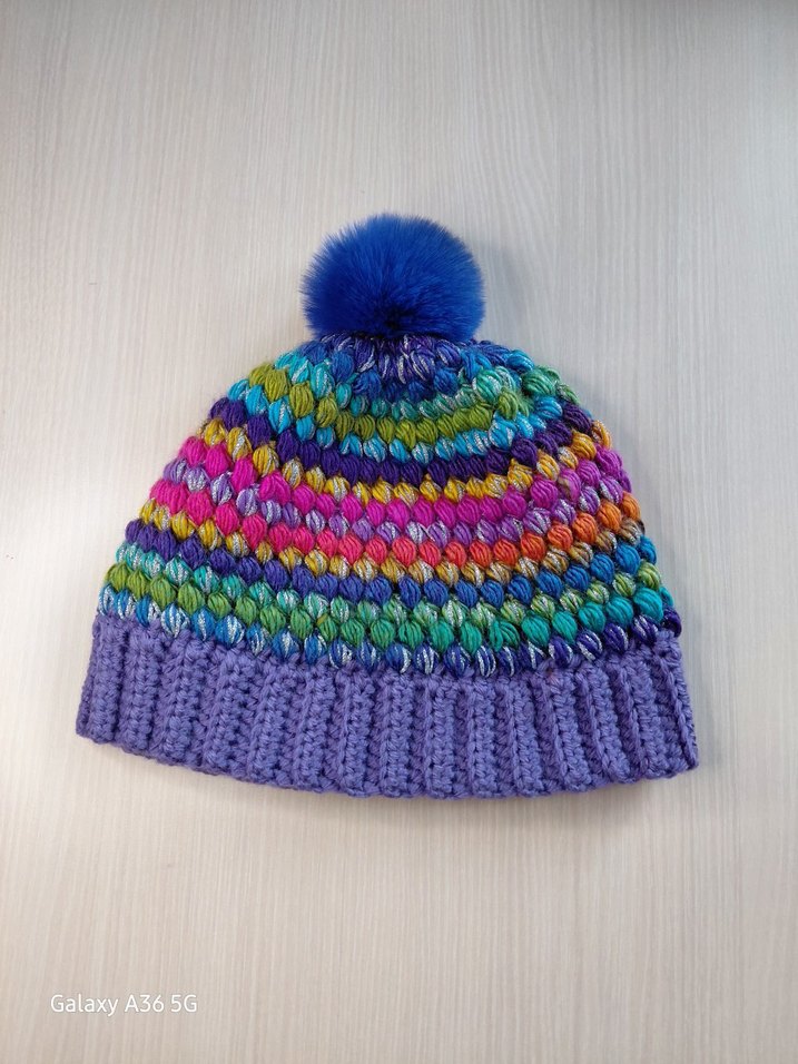 Yumuşak ponponlu, renkli örgü kadın bere. Rahat ve bohem tarzıyla retro ve hippie görünüme uygundur.