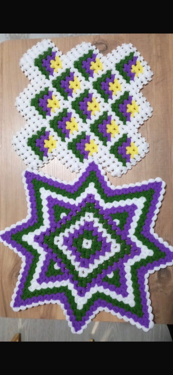 Yumuşak iplikle yapılmış, beyaz, mor, yeşil ve sarı renklerde el örgüsü renkli yıldız ve kare motifli lifler adet fiyatı