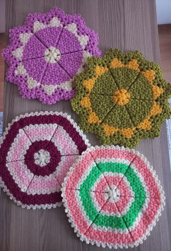 Birbirinden renkli, yuvarlak ve el örgüsü lifler. İnce detaylı desenlere ve yumuşak dokuya sahiptir. Dört adet fiyatıdır.