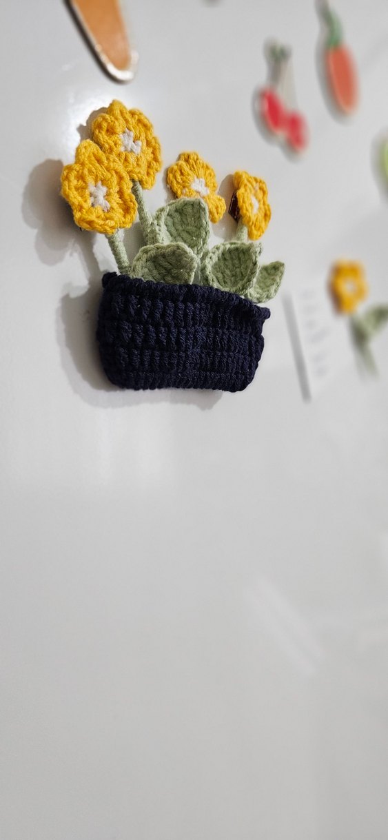 El örgüsü, bohem tarzda sarı çiçekler ve yeşil yapraklar içeren koyu mavi saksılı buzdolabı magneti ( içerisinde bir saksı ve 5 çiçek bulunuyor)