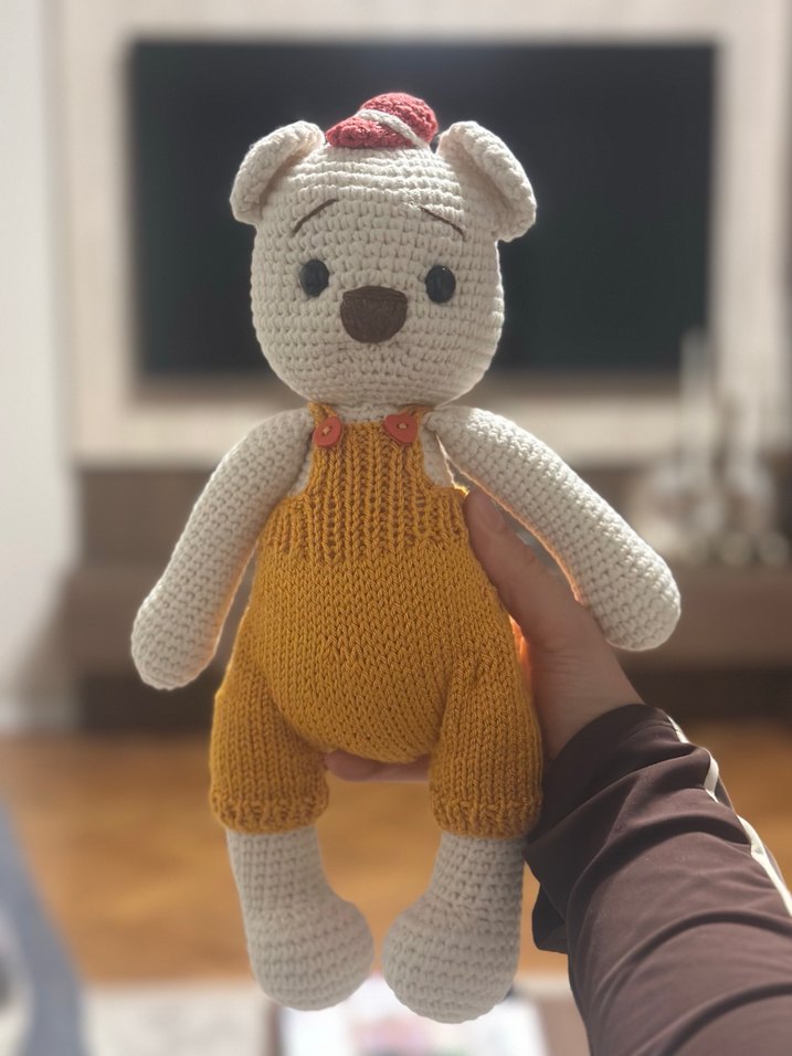 El örgüsü sarı tulumlu peluş ayıcık, yumuşak ve sevimli oyuncak .