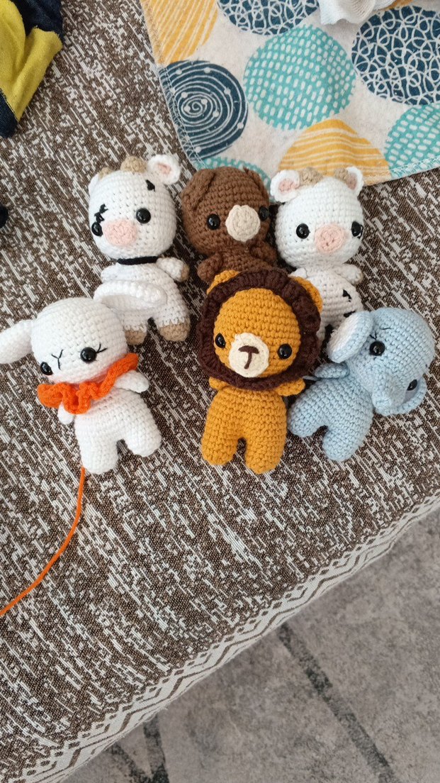 Yumuşak iplikle yapılmış, açık ve deve tüyü tonlarında el örgüsü sevimli hayvan peluş oyuncaklar. Her biri işlenmiş detaylara sahip. 5adet