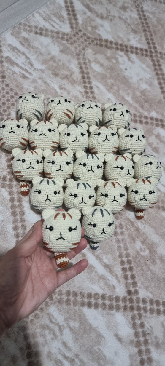 El örgüsü, farklı renklerde basit yüz ifadeli sevimli kedi figürleri. Yumuşak dokulu ve küçük boyutlu, dekorasyon veya hediye için uygun.