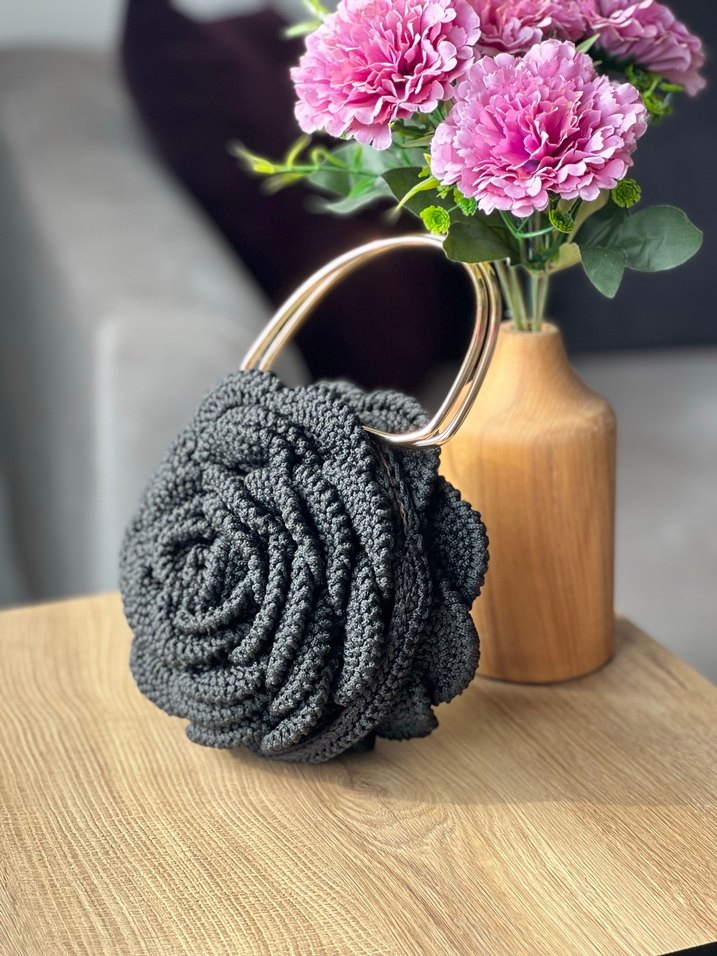 Siyah renkli, örgü gül desenli ve yuvarlak saplı bohem tarzda, günlük kullanıma uygun kadın çantası.