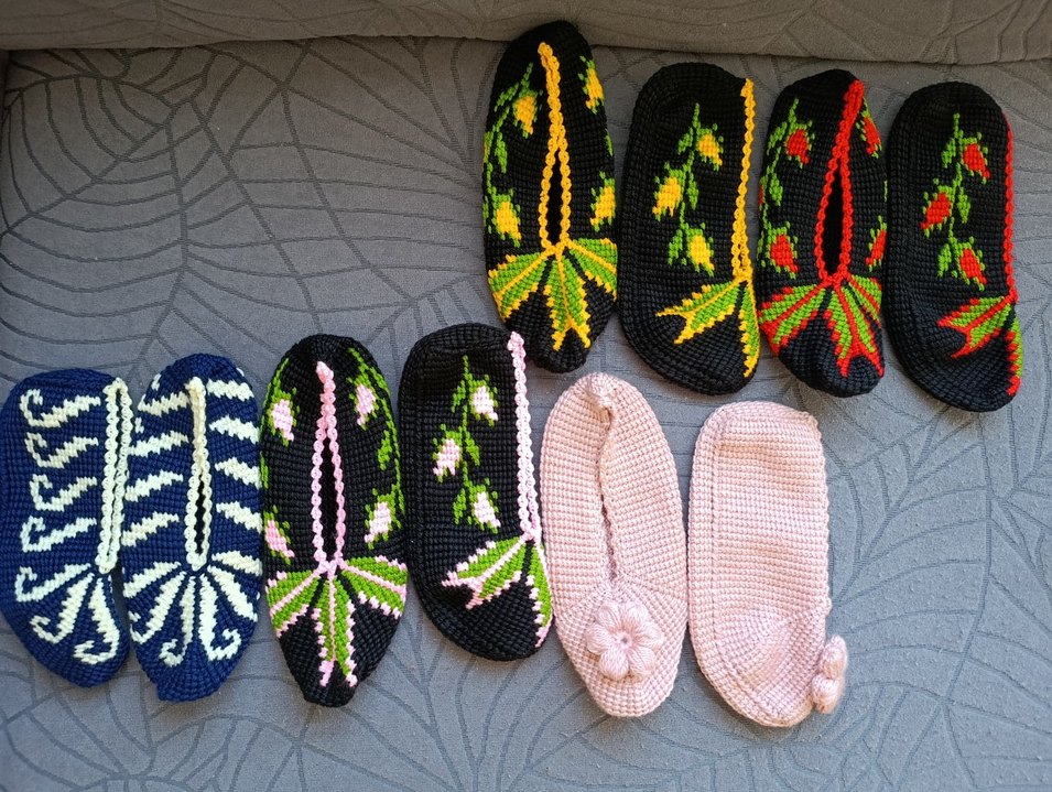 Çeşitli renklerde çiçek desenli, el örgüsü, yumuşak ve sıcak kumaştan patikler. elimde hazır isteyene kargo yapılır