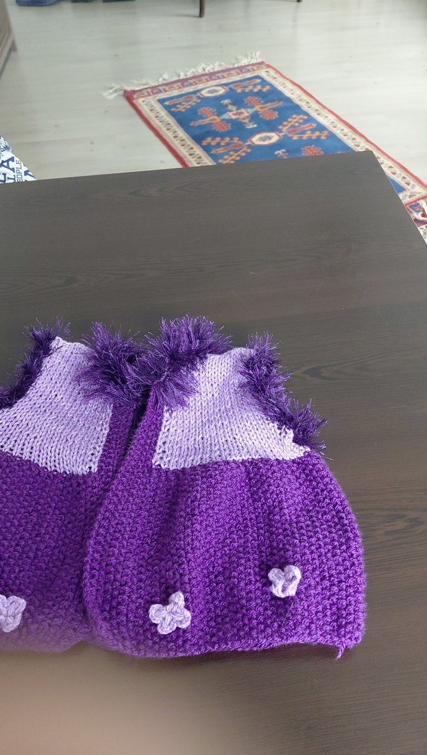 Mor renkli, kapüşonlu, kolsuz kız çocuk pançosu, örme ve bol kesimdir. Kenarlarında süslemeler bulunur.