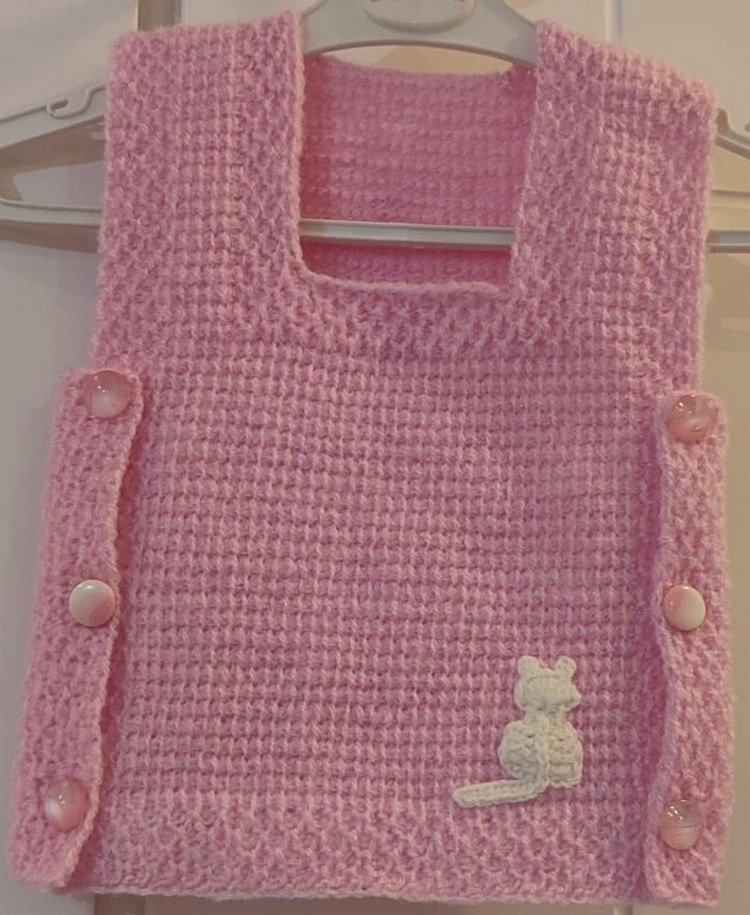 Pastel pembe renkli, örgü kız çocuk süveteri, kolksuz ve yanlarda düğmeli, önünde küçük kedi detayı bulunan bol kesim.
