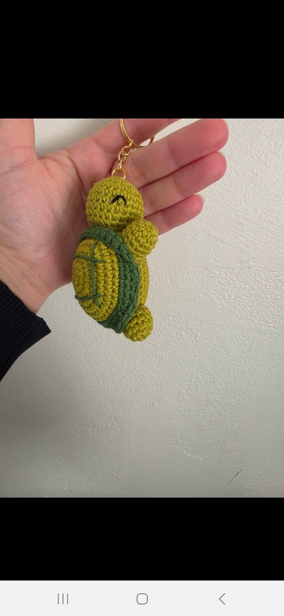 Yumuşak dokulu, el örgüsü yeşil kaplumbağa anahtarlık, renkli ve bohem tarzıyla retro bir dokunuş sağlar.