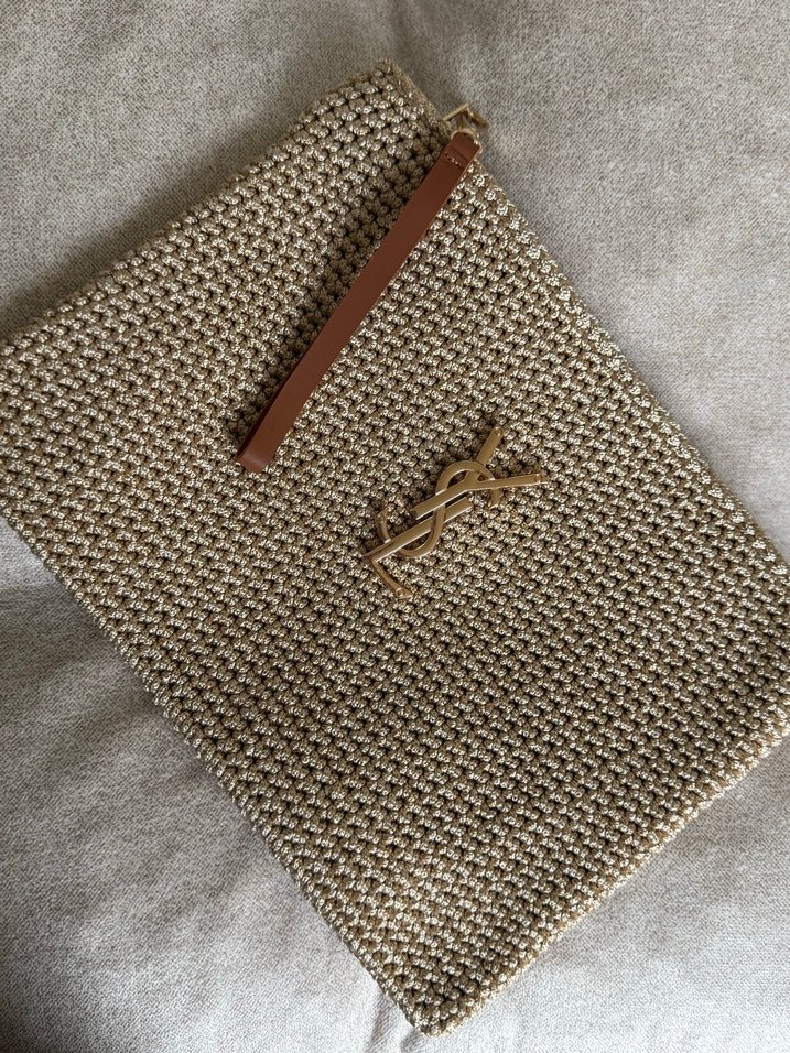 Bej renkli, işlemeli örgü kadın çanta, kahverengi deri saplı, minimal ve bohem tarzda günlük kullanım için uygun.