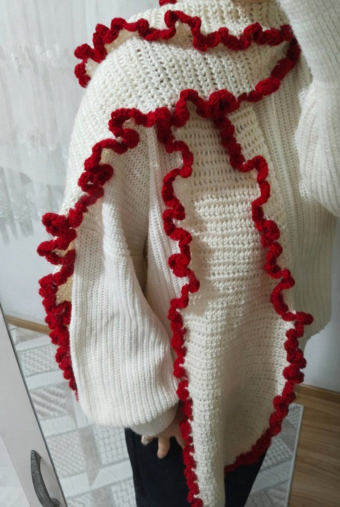 Kırmızı fırfırlı detaylara sahip, yumuşak ipten örülmüş el emeği atkı. Sıfır üründür. Ölçü: 170 cm boy – 25 cm en Hediye için uygundur ✋ Kendi ördüğüm üründür İstenilen renk ve ölçüde sipariş alınır.
