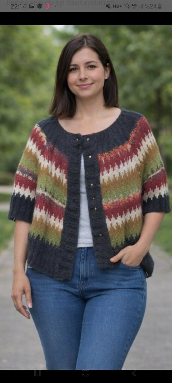Bohem tarzı, bol kesim ve kayık yaka yarım kol uzunlukta çok renkli örgü hırka. Uzun kollu ve bağlama desenli, günlük kullanıma uygun.