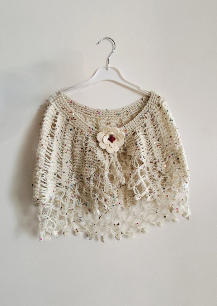 Örgü kumaştan yapılmış, nakışlı ve dantelli detaylara sahip bol kesim kız çocuk ponçosu. Askılı ve straplez yaka tasarımıyla bohem tarzda, açık beyaz renkte.