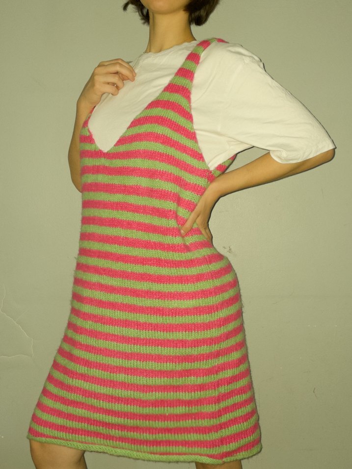 Bu el örgüsü yünlü elbise, fuşya ve yeşil renkli yatay çizgili deseniyle öne çıkan, modern bir tasarıma sahiptir. V yakası ve kalın askılarıyla hem şık hem de rahat bir görünüm sunar. Elbisenin esnek ve yumuşak dokusu, sıcak tutarken aynı zamanda rahat bir giyim deneyimi sağlar. Özellikle soğuk havalarda beyaz bir tişört veya kazakla kombinlenerek farklı tarzlar yaratılabilir. Bu benzersiz parça, bohem ve sanatsal bir tarzı yansıtırken, canlı renkleriyle de neşeli bir hava katıyor. Oversize tarzındadır.