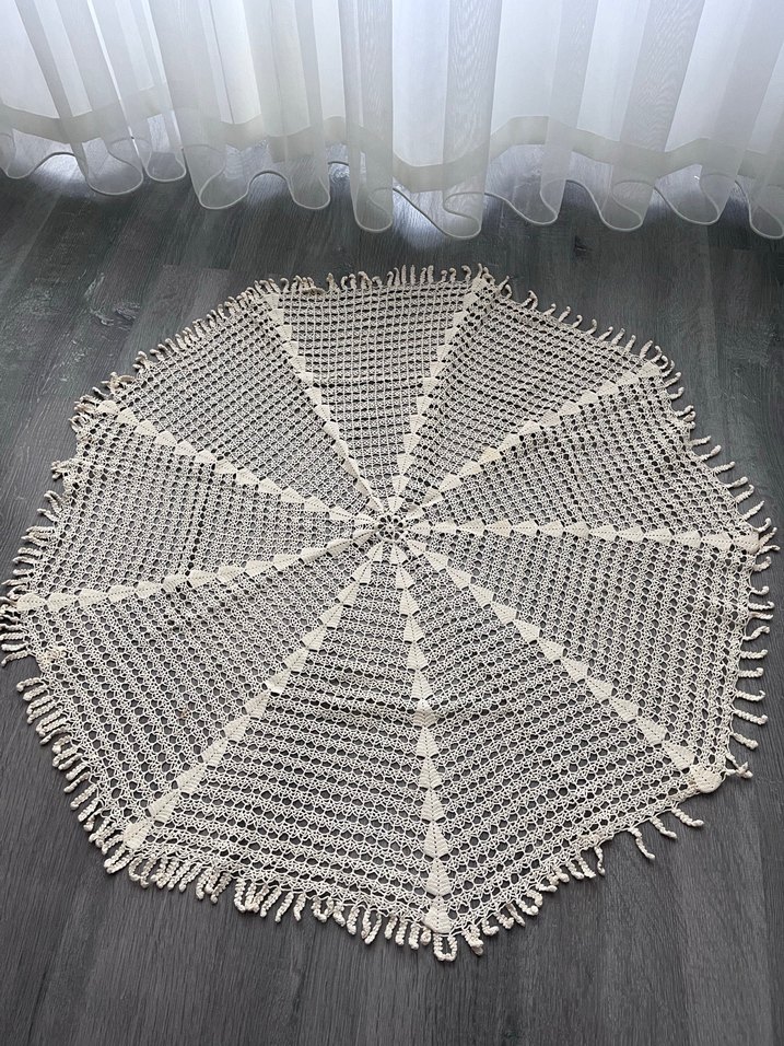 Bohem tarzda, el örgüsü yuvarlak fiskos masası örtüsü, püsküllü kenarlarıyla doğal ve sanatsal bir dokunuş sağlar. Çwyizlik el emeği sıfır