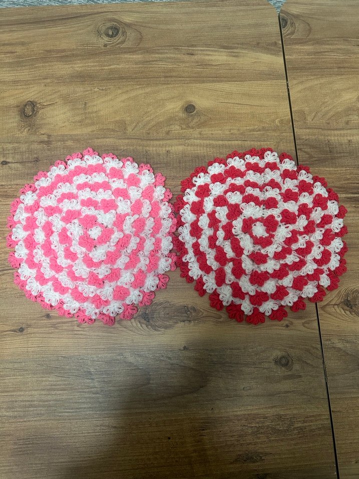 Pembe-beyaz ve kırmızı-beyaz desenlerde el örgüsü, yuvarlak iki adet yumuşak iplikten lif seti. #ceyiz #ceyizlifi #örgülif
