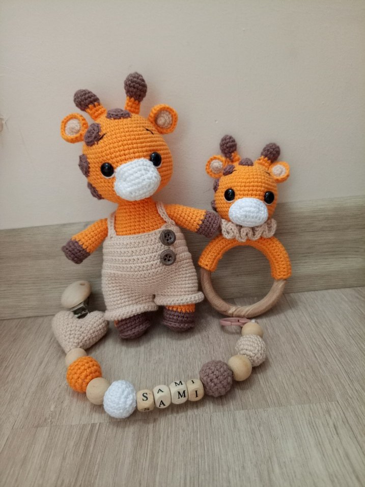Yumuşak el örgüsü zürafa diş kaşıyıcı ve çıngırak seti, ahşap boncuklar ve Sami ismiyle kişiselleştirilmiş.