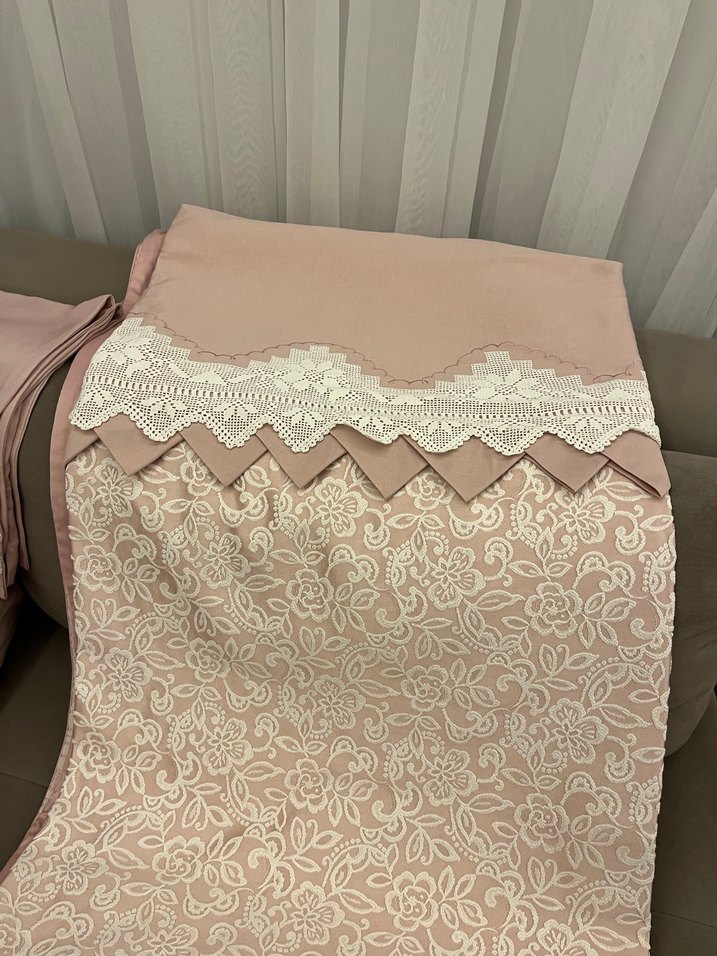 Pastel pudra renkte, çiçek nakışlı ve dantel süslemeli yumuşak dokulu nevresim takımıdır. Kumaşı çok kalitelidir çeyizim için diktirildi hiç kullanmadım yatagım battal boy olduğu için uyumlu değil