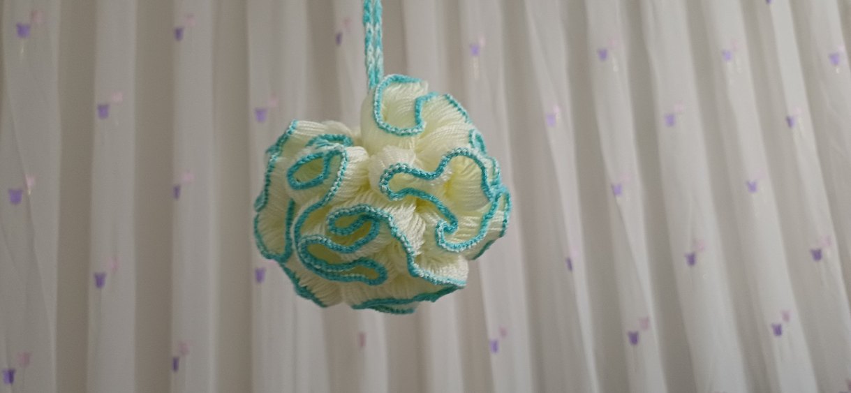 Turkuaz kenarlı, askılı renkli banyo süngeri. Yumuşak dokusu ile nazik temizlik sağlar.