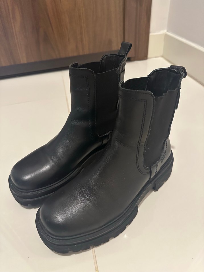 Siyah suni deri ve kalın topuklu kadın botları, günlük sokak stiline uygun şık tasarıma sahiptir. Çok sıcak tutar, yağmur geçirmez, karda kaymaz. Altlarından anlaşılacağı gibi çok az giyildi.