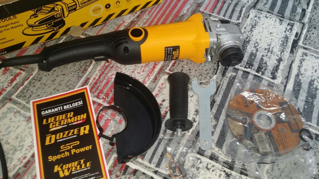 Sarı renkli el taşlama makinesi, çıkarılabilir tutacak, koruyucu kapak, anahtar ve aksesuarlarla birlikte gelir. ⚙️ devir ayarlı sıfır kutusunda