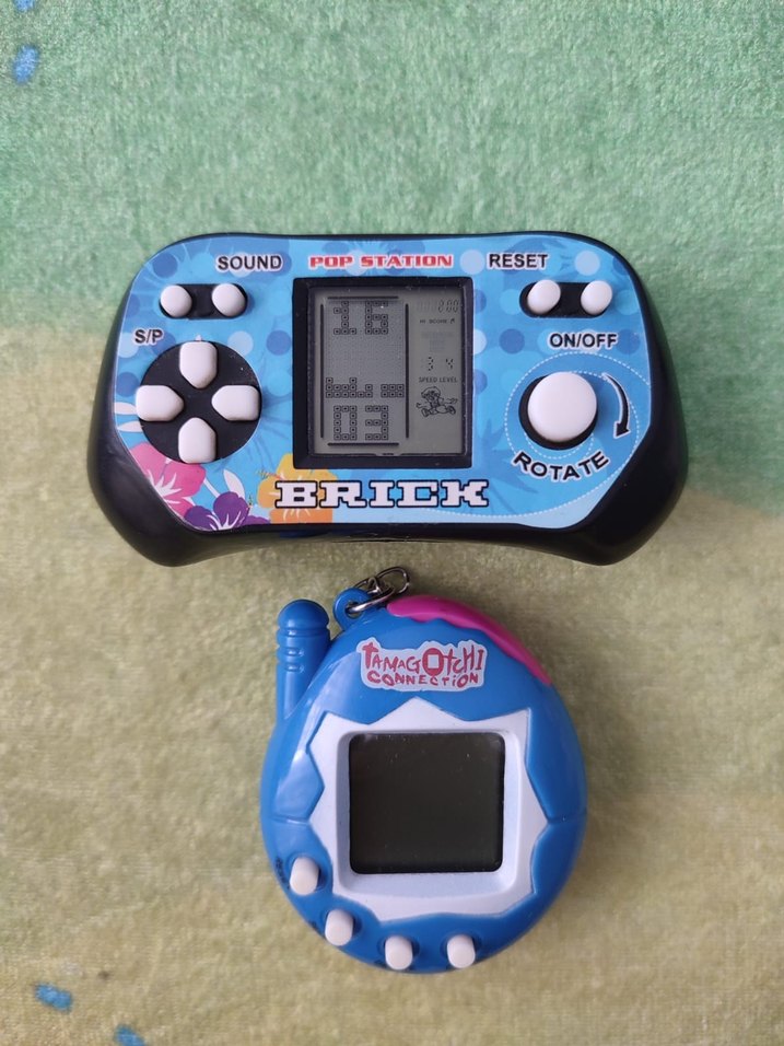 Ses, açma/kapatma ve sıfırlama düğmelerine sahip renkli mavi el tipi oyun konsolu ve anahtarlıklı mavi Tamagotchi sanal Bebek cihazı. 2 adet fiyatıdır