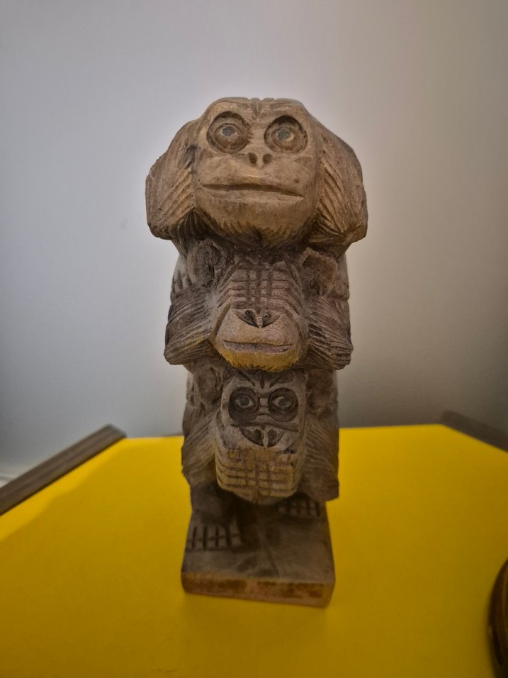 Kapanan mağazamızın ürünüdür.Kahverengi ve gri ahşaptan yapılmış, üst üste dizilmiş üç maymun figürünü içerir; gözlerini, kulaklarını ve ağızlarını kapatıyor, 'kötülüğü görme, işitme, konuşma' anlamını taşır.