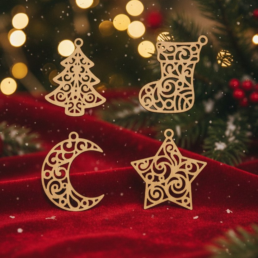 Yeni yıl ruhunu evinize taşıyacak özel tasarım ahşap süsler! Bu 4'lü set; çam ağacı, çorap, hilal ve yıldız figürlerinden oluşur. Her biri lazer kesimle üretilmiş, detaylı oymalarla süslenmiştir. Kırmızı kadife zemin üzerinde sunulan bu ürünler, hem şık hem nostaljik bir atmosfer yaratır. Ağaç süsleme, masa dekoru veya hediye alternatifi olarak ideal. El yapımıdır, sınırlı stok! - Malzeme: Doğal ahşap - Adet: 4 parça - Boyut: Her biri yaklaşık 8-10 cm - Kargo: Özenle paketlenerek gönderilir