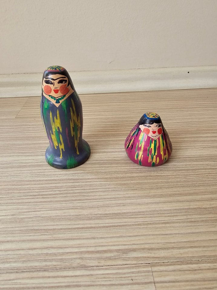 Sadece büyük olanın arkasında ufak bir çatlak var, fotoğraflarda mevcut. İki farklı boyutta, geleneksel desenlerle el boyaması renkli figürinler. Koleksiyonlara canlılık katar.