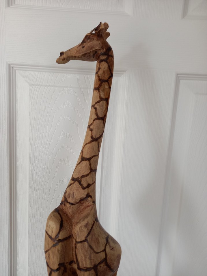 El yapımı ahşaptan yapılmış oyuncak zürafa dekoratif dekorasyon ürünü. Fotoğraflarda da görüldüğü üzere bacaklarında ve kulağın tekinde deformeleri kırıkları var.