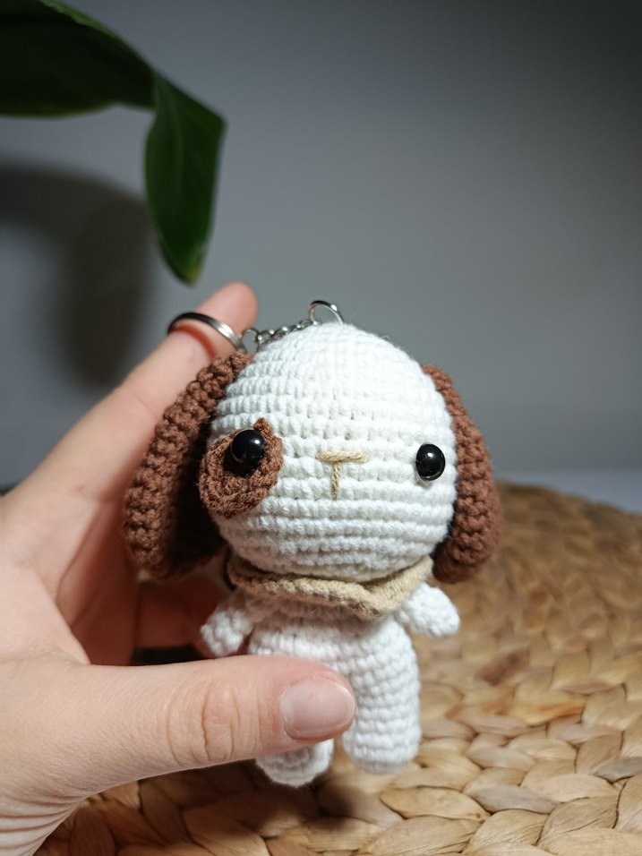 dönen göz detaylı krem veya siyah yaka detaylı köpek amigurumi el yapımı anahtarlık