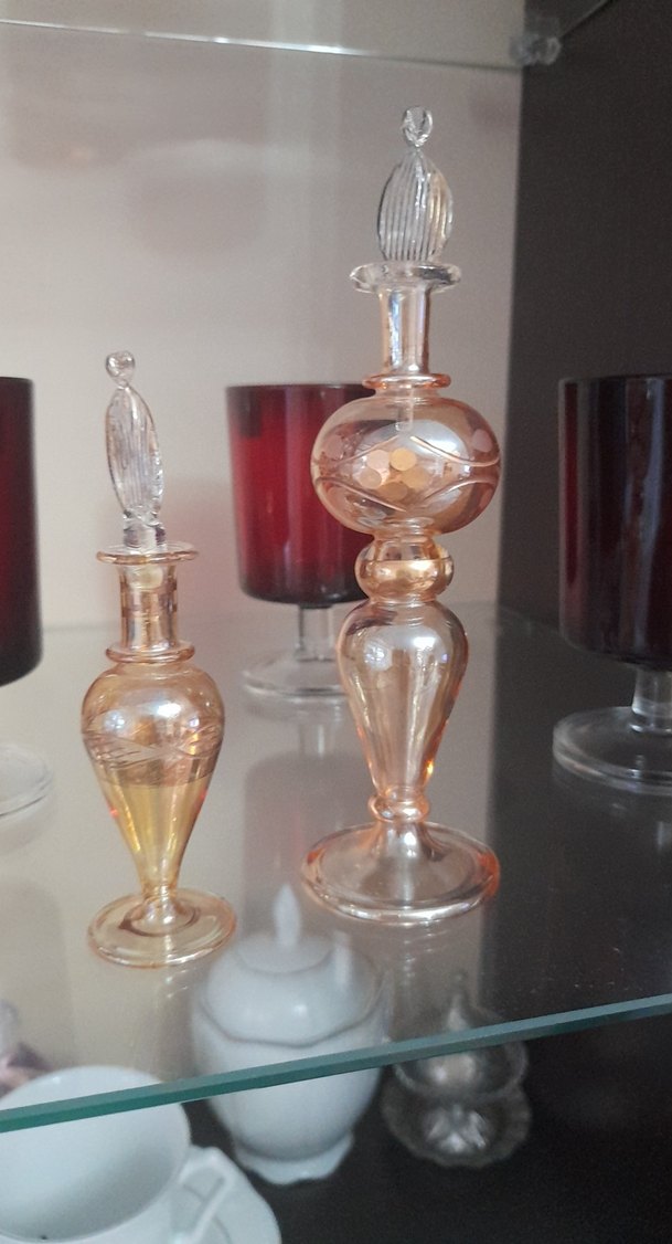 El yapımı, ince camdan yapılmış vintage kadın parfüm şişeleri. Koleksiyon veya dekorasyon için uygundur. el yapımı üfleme camdir 2li fiyatıdır kırık çatlak yoktur