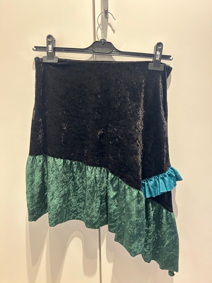 Annem tarafından özenle dikilmiş, tek parça el yapımı etek. Kadife dokulu siyah kumaş ile yeşil tonlarında dökümlü kadife kumaş bir arada kullanılmıştır. Asimetrik kesimi ve fırfır detayı sayesinde oldukça özgün ve dikkat çekici bir duruşu vardır. Vintage, bohem ve alternatif tarz kombinler için uygundur. Günlük kullanımdan ziyade özel parçalar sevenler için idealdir. El yapımı – tek adet Asimetrik kesim Kadife dokulu, yumuşak kumaş Beden: (buraya bel/kalça ölçüsü eklenirse süper olur) Durum: Çok iyi – kusur yok