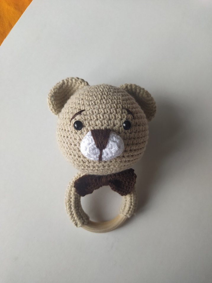 Yumuşak örme dokulu, ahşap halkalı el yapımı kahverengi ayıcık diş kaşıyıcı oyuncak. Renkli ve bebeklerin tutup çiğnemesi için uygun. Ürün boyu 16cm Coton iple örülmüştür Toplu alımlar için lütfen mesaj atınız #çıngırak #süs #aksesuar #ayıcık #örgü #amigurumi