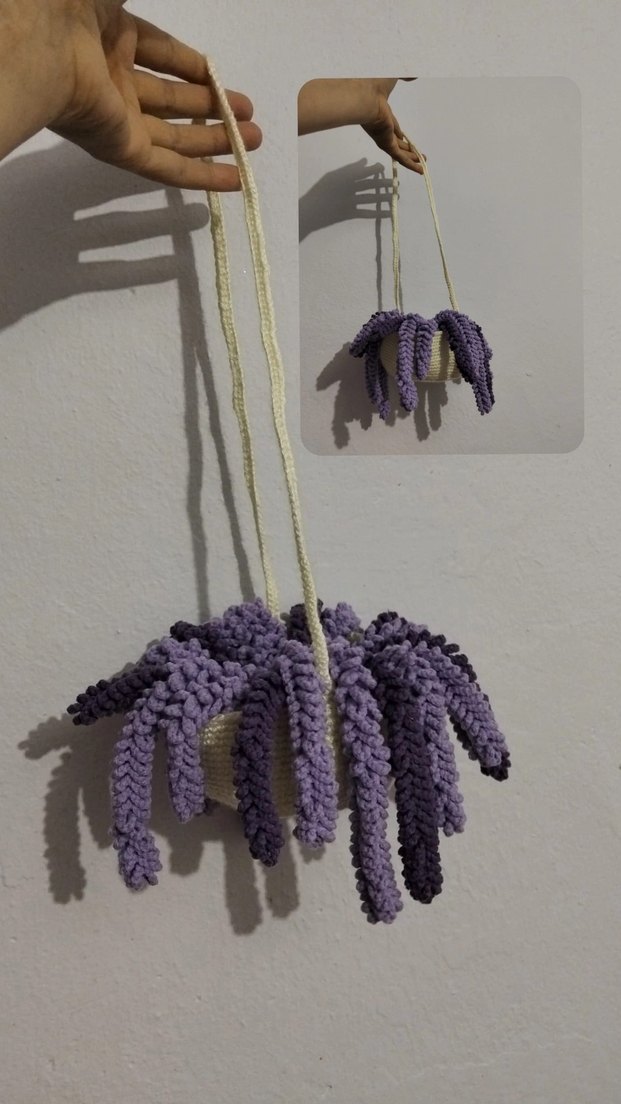 Yumuşak dokulu mor örgü iplerden oluşan, asılan duvar süsü. Mekâna sıcaklık katar.
