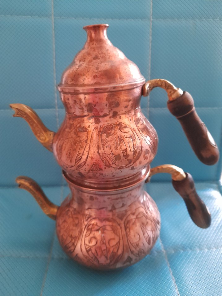 Parlak bakır renginde, oyma detaylı ve ahşap saplı, deve tüyü tonunda çaydanlık. Geleneksel çay demlemek için uygun.