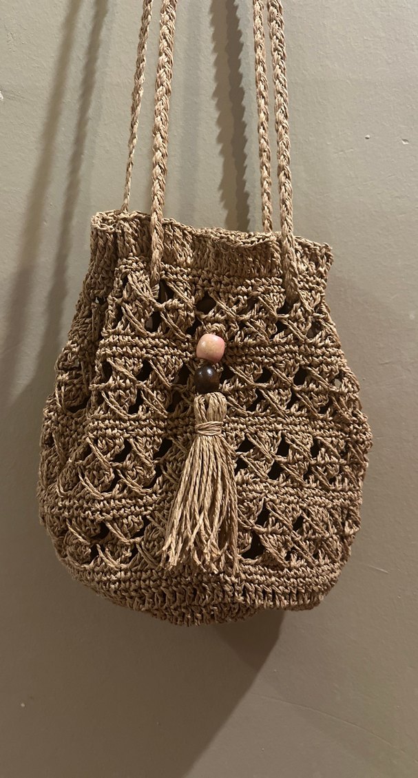 El yapımı Bej Nakışlı Püsküllü Örgü Kadın Çanta